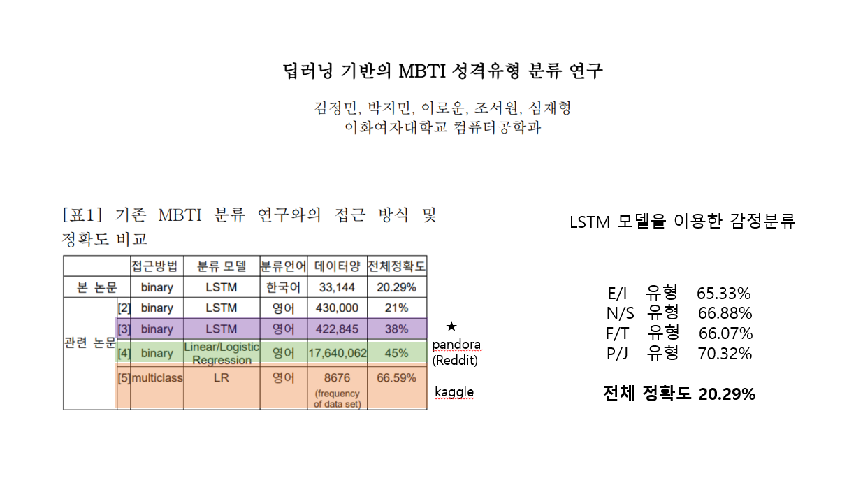 논문에 대한 이야기를 해보자면, 위의 국문 논문은 **LSTM 모델을 이용해서 MBTI를 감정분류를 하듯이 분류**하였다. 다시말해 binary 분류를 한 것이다.