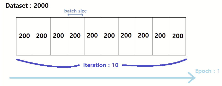 전체 데이터셋을 처리하기 위해 10번 반복해서 업데이트가 이뤄짐 (2000 = 200x10)